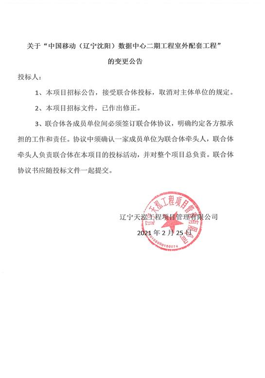 關(guān)于“中國(guó)移動(dòng)(遼寧沈陽(yáng))數(shù)據(jù)中心二期工程室外配套工程”的變更公告